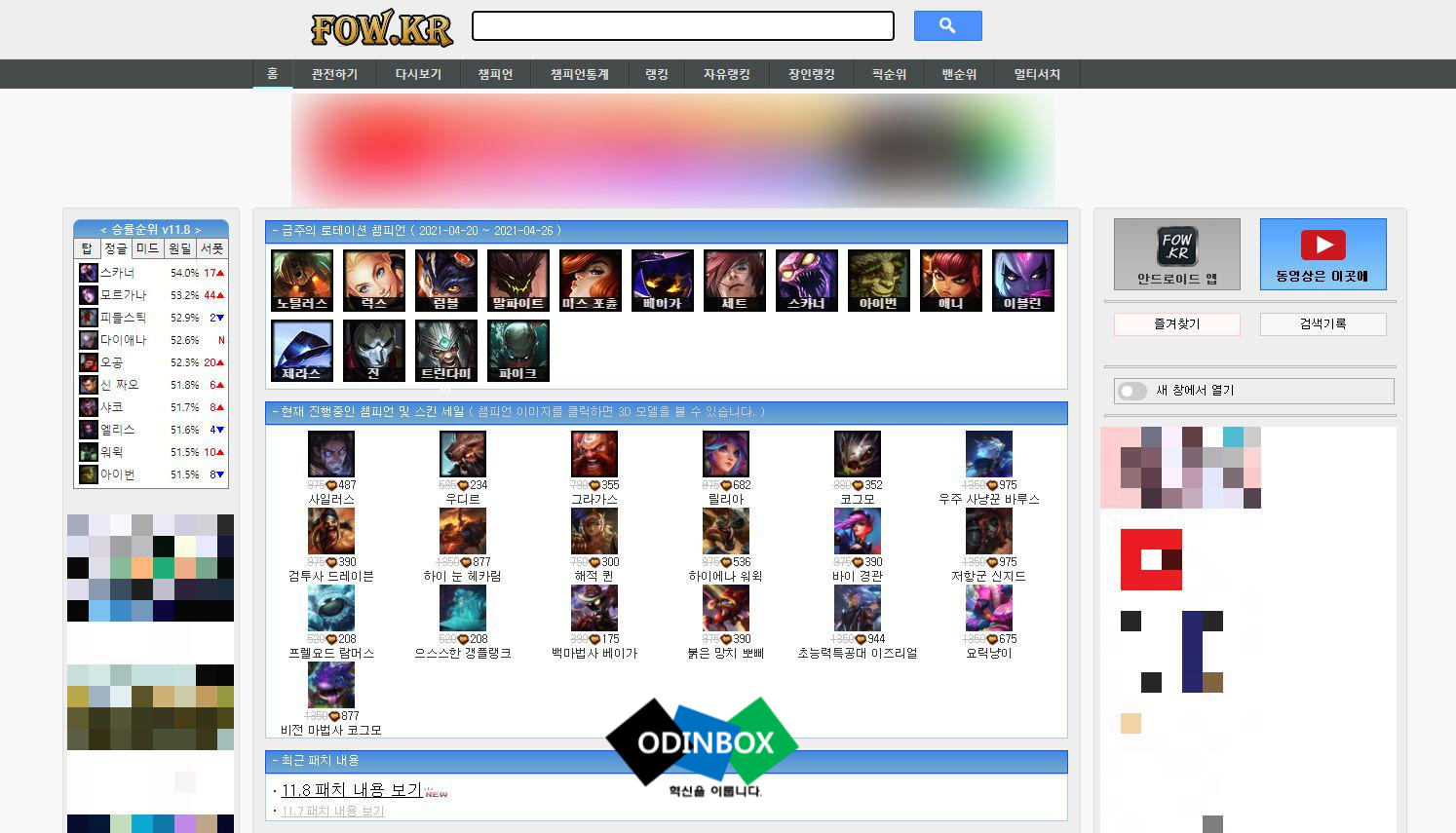 FOW.KR은 옛날에 메인 화면에 롤과 관련된 동영상들이 나오고 재미있는 동영상을 보는 재미가 있었습니다 지금도 롤 관련 동영상은 상단 오른쪽 부분에 동영상은 이곳에를 누르면 동영상이 모여져 있는 곳으로 이동이 됩니다 메인은 단순한 느낌이 강해 깔끔하기도 하면서 허전하기도 합니다 아쉬운 점은 광고가 지나치게 많이 보인다는 점입니다.