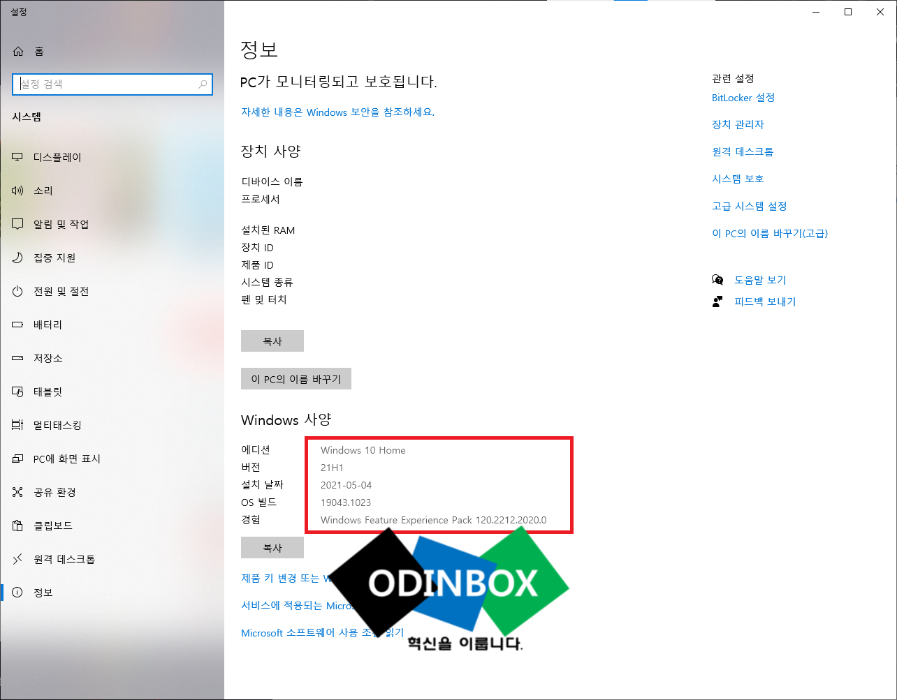 해당 화면이 나오는 것을 확인을 할 수 있는데 해당 화면에서 에디션에 적혀있는 것을 기억하고 계시면 됩니다. 위 방법 말고 '제어판→시스템→정보→Windows 사양'로 들어가셔도 됩니다.