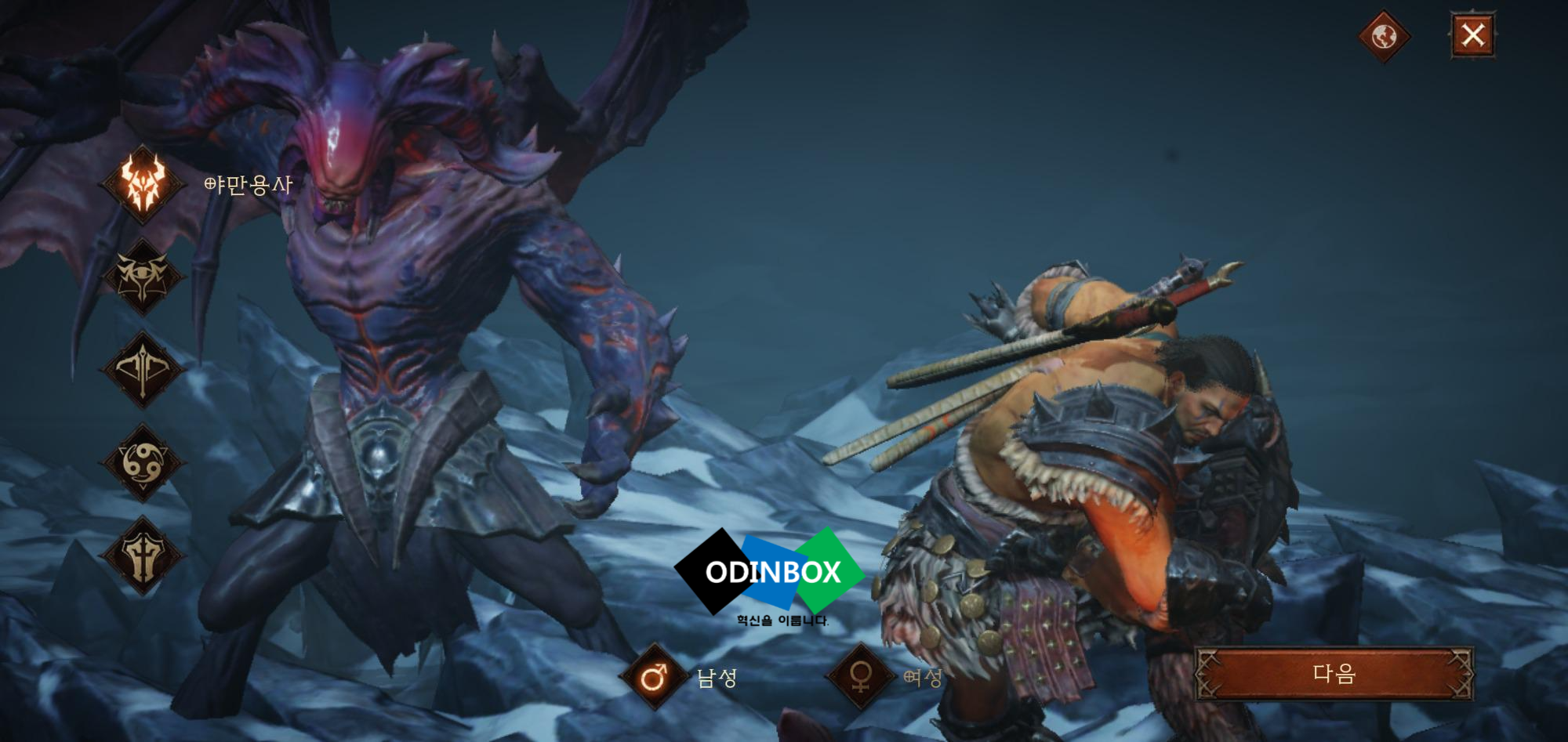 캐릭터가 없는 경우 생성할 수 있습니다. 이모탈의 경우 직업은 야만용사, 마법사, 악마사냥꾼, 수도사, 성전사가 있으며 성별을 과 함께 외형을 설정하고 이름을 설정하고 만들기를 누르면 됩니다.