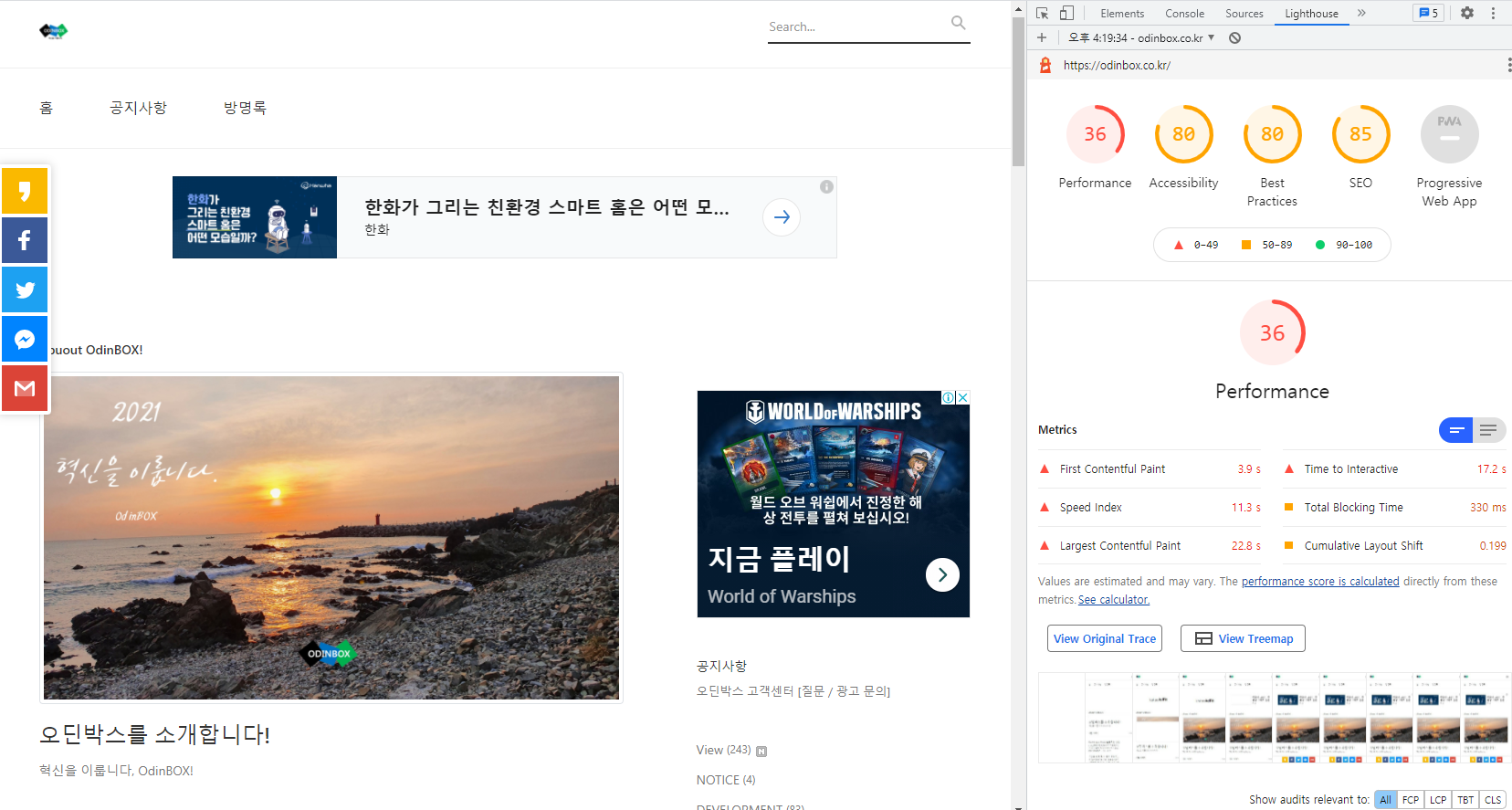 왼쪽은 모바일로 측정을 진행한 것이고, 오른쪽 사진은 PC(데스크톱)으로 측정을 진행했습니다. 둘 다 점수가 크게 높지는 않지만 모바일 측정은 Performance(성능)은 형편없는 점수가 나왔습니다. 다른 점수들도 그렇고 왜 이런 점수가 나왔는지는 스크롤을 내리면 각각 다 알 수 있습니다. 왜 여기서 이런 점수가 나왔는지에 대해서 알 수 있어 대응할 수 있도록 되어있어 편의가 좋습니다.