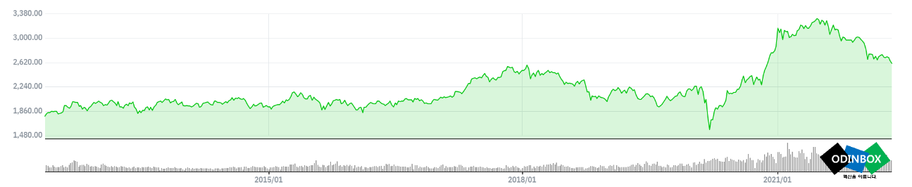 위 그래프를 보면 알겠지만 2021년 01월부터 2021년 중후반까지 상승세로 인해서 주식을 잘 몰랐던 분들도 이때 많이 입문을 했고 주식에 관련된 이야기가 많이 나왔었습니다.