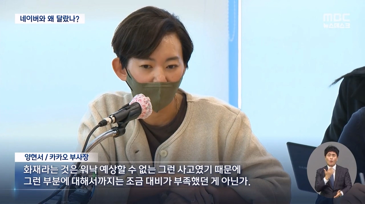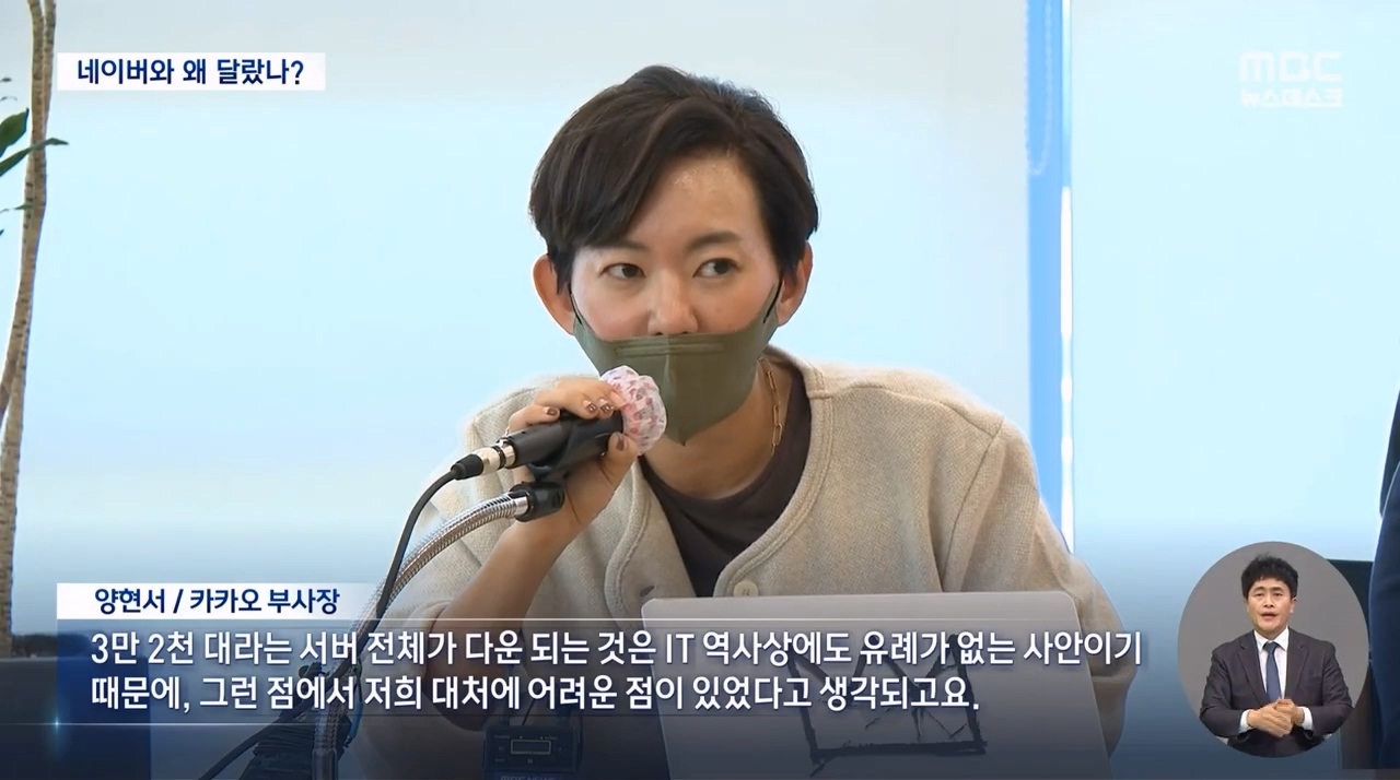 하지만 카카오는 달랐습니다. 카카오의 말은 이원화가 되어있었지만 복구까지 시간이 걸렸다고 말했으며 화재에 대한 대응 시나리오는 없었다는 기사[#]에 있었습니다. 이 말은 결국 대책 없이 전혀 없었다는 소리와 같은 소리입니다.