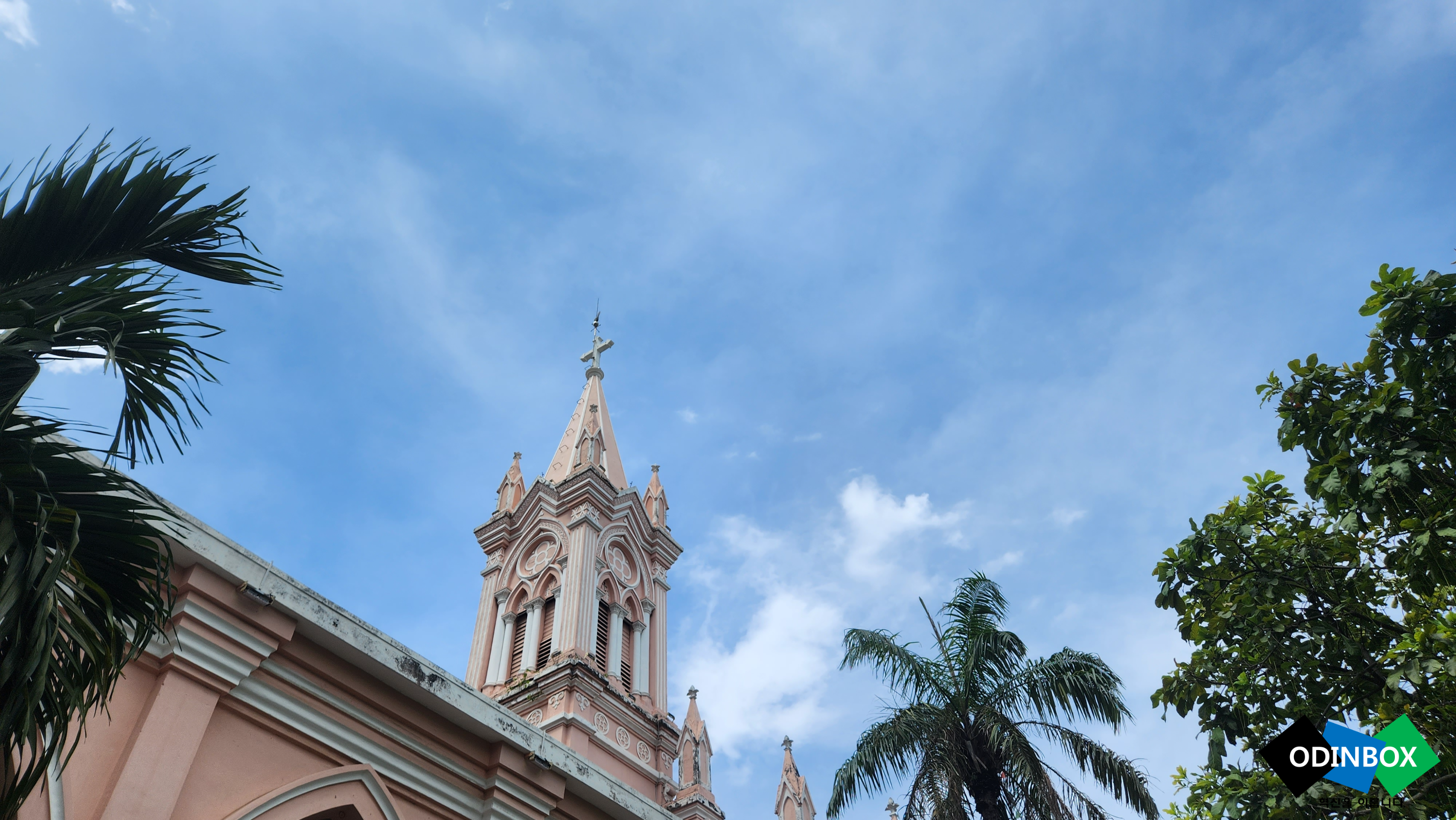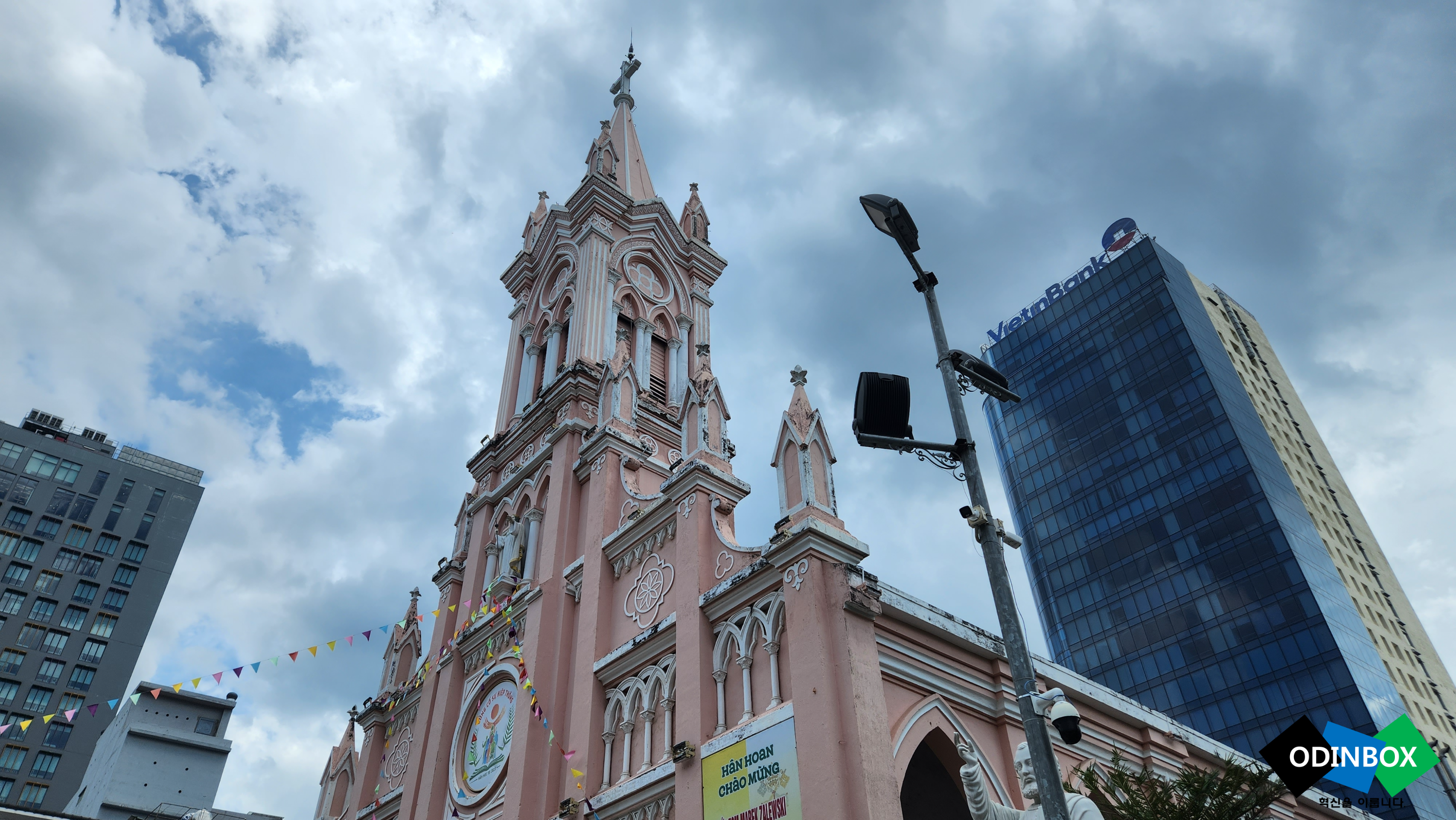 Đây là Đại thánh đường nằm ở Đà Nẵng. Điều thú vị ở đây là nhà thờ đặc biệt có màu hồng cùng với hình dáng điển hình của phương Tây, vốn dĩ định làm bằng màu đỏ nhưng có câu nói rằng nó đã trở thành màu hồng do thiếu sơn. Và nếu bạn nhìn lên đỉnh, nó trông như một con gà. Như tôi đã nói trước đó, Việt Nam đã từng là thuộc địa của Pháp, được xây dựng vào năm 1925. Và nếu bạn nhìn sang một bên, bạn sẽ thấy dòng nước thánh chảy cùng với tượng Maria.