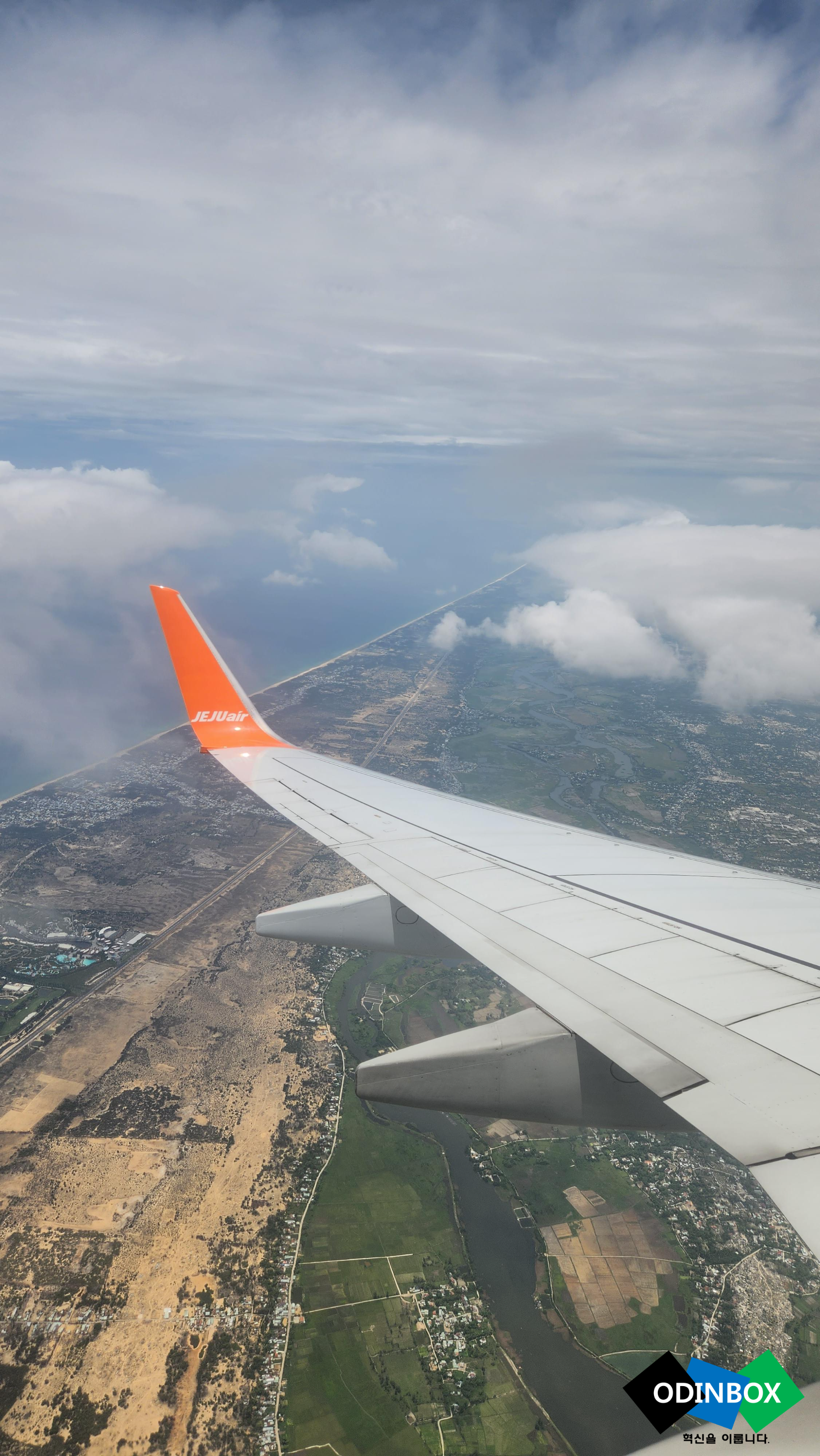 공항을 도착하고 출국 수속을 마친 뒤 입국장으로 향했습니다. 면세점이 위치하고 있어 필요한 것이 있는가 쭉 둘러봤지만 가격이 사실 그동안 세금이 안 붙으니 싸다고 말을 들었지만 생각보다 그렇게 싼 느낌은 안 들었습니다. 그렇게 주위를 한번 쭉 다 둘러보고 9시부터 탑승이 가능하다는 안내방송이 나왔습니다. 다낭으로 갈 때 타게 될 비행기는 제주항공(JEJUAIR)에 4C2955편을 탑승을 하게 되었습니다. 정말 다행히 첫 여행인데 비행기 밖 풍격을 보고 싶었는데 운이 좋게 창가 자리에 앉을 수 있었습니다. 9시 30분이 되고 승무원 분들의 안내방송과 함께 이륙을 하게 되었습니다. 인터넷을 찾아보니 이륙이나 착륙 시 엄청 흔들린다는 말이 있었지만 생각보다 크게 흔들리지는 않았습니다. 그 무겁던 비행기가 하늘을 향해 날아오르고 땅과 점점 멀어지더니 높이 올라가기 시작했습니다. 처음 보는 풍경에 이곳저곳을 찍고 싶었지만 김해공항 활주로 부분 쪽이나 이런 쪽은 보안에 의해 사진 촬영은 금지가 된다고 하여 시간이 어느 정도 지나고 하늘을 날고 있을 때 사진을 찍게 되었습니다. 그렇게 비행시간 5시간 계속된 하늘과 구름만 보이던 곳이 육지가 보이기 시작합니다. 그 육지에 베트남에 도착을 하게 되었다는 것을 알려주는 듯합니다.