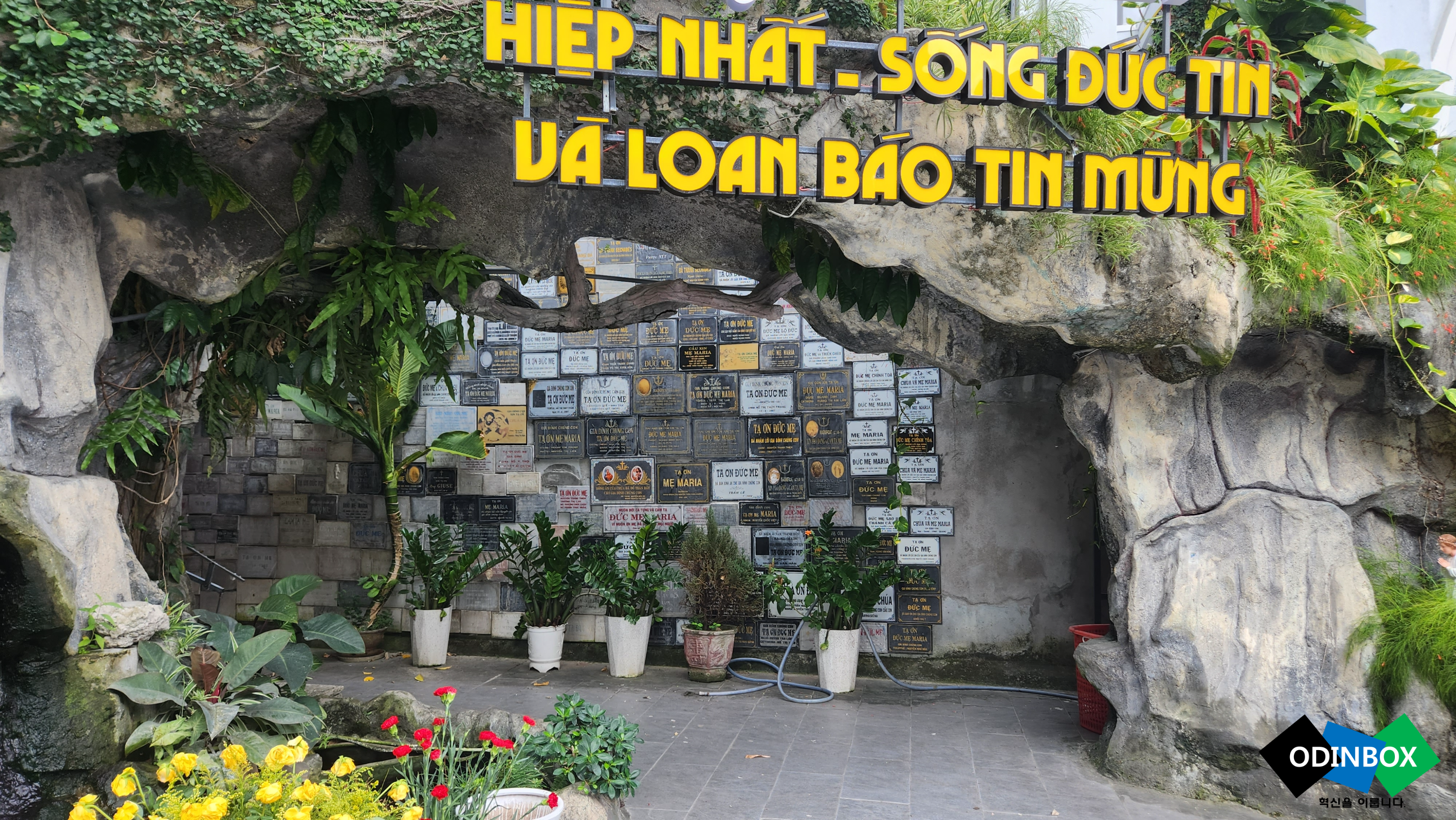 It's a cathedral located in Danang. What's fascinating about this place is that it's a unique church in pink with a typical Western appearance, and there's a saying that it was originally going to be red, but it was pink due to a lack of paint. And if you look at the top, it's shaped like a chicken. As I mentioned earlier, Vietnam had a French colonial period and it was built in 1925. And if you look to the side, you see the holy water flowing with the statue of Mary.