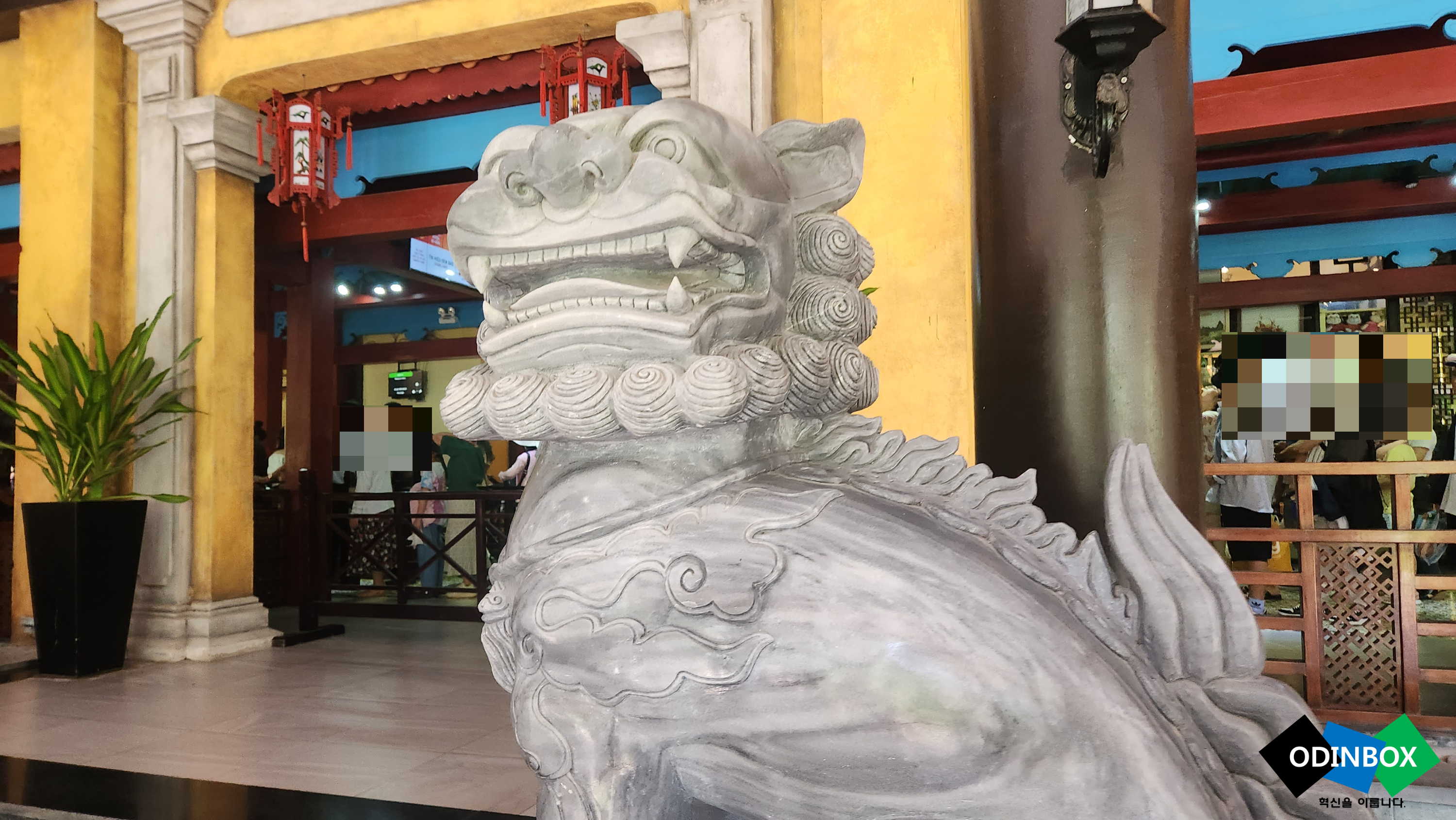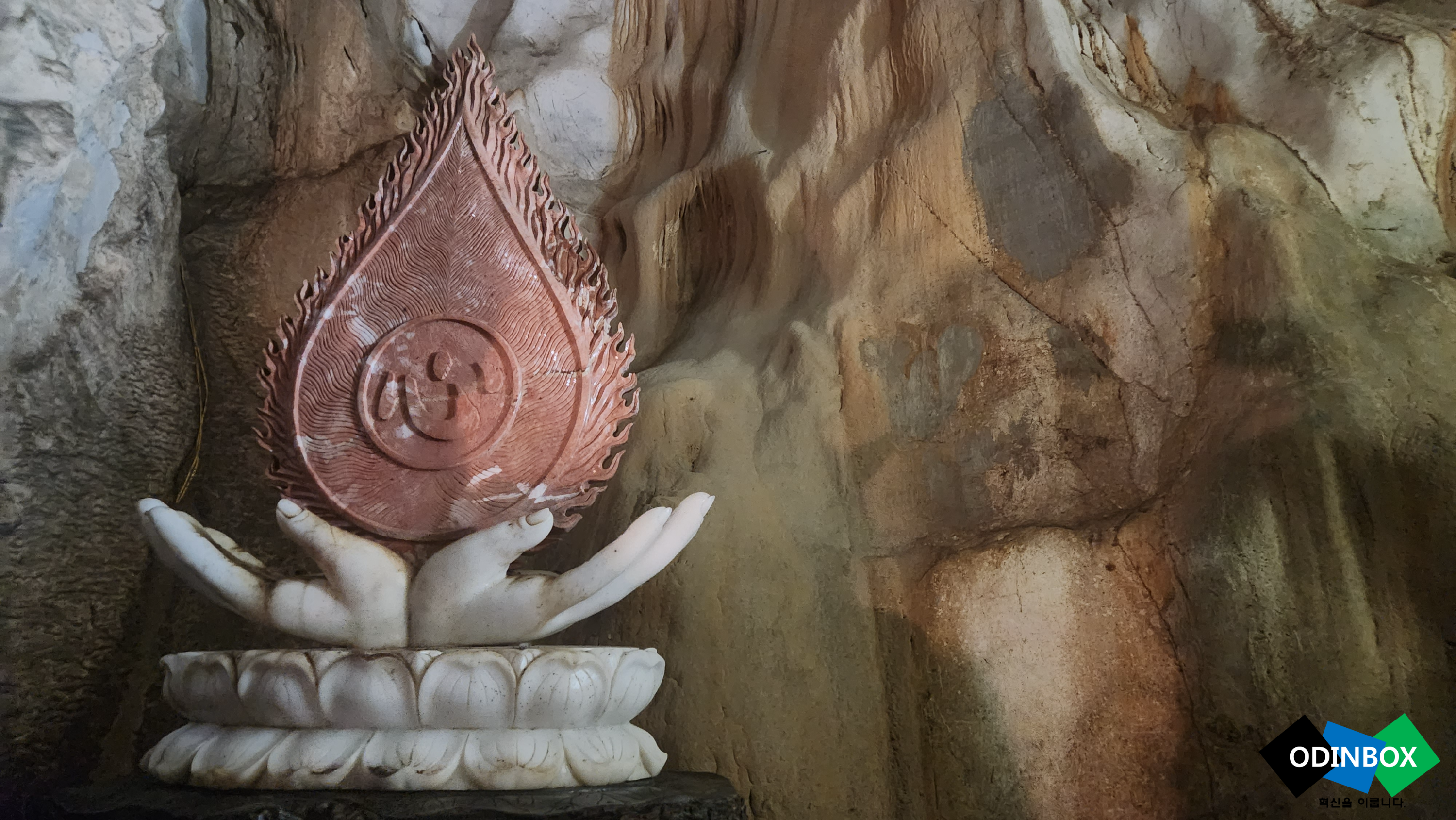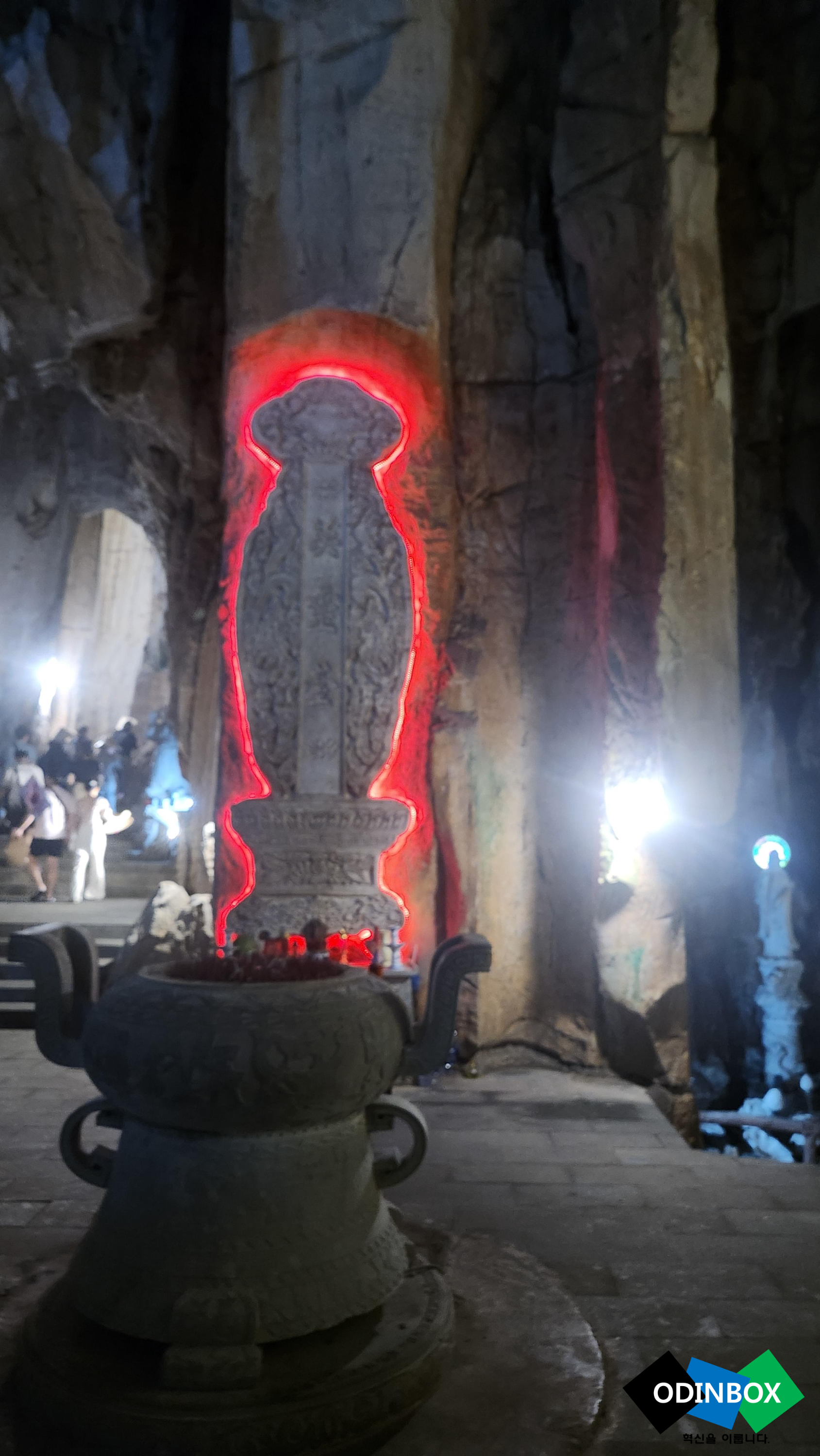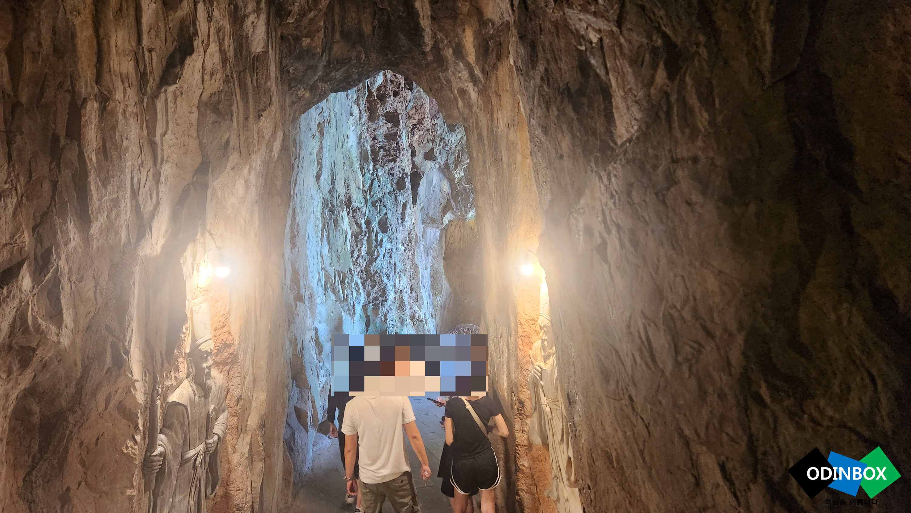 마블마운틴의 경우 오행산의 영어 이름으로 불리고 있습니다. 우리가 잘 알고 있는 이름의 경우 오행산이라는 이름으로 조금 더 흔하게 알 수 있는 이름 중 하나입니다. 버스를 타고 도착을 하고 천천히 내리기 시작합니다. 첫 여행지인만큼 가이드 분께서 베트남의 모자인 논라(Nón Lá)를 준비를 해서 줬습니다. 이때 햇빛이 생각보다 강하기도 했고 얼굴이 뜨겁기도 하여 모자를 잘 안 쓰고 다니지만 이때는 거의 항상 모자를 착용을 했던 것 같습니다. 오행산의 경우 베트남 다낭의 남부에 있는 응우하인선군이라는 곳에 위치를 하고 있고 대리석과 석회암 등으로 이뤄져 있는 언덕과 함께 산이 위치하고 있는 곳입니다. 입구에 도착을 해서 동굴 안으로 들어갔습니다. 이 동굴을 보게 되면 구멍이 생겨있는데 베트남전 때 미군의 포격으로 동굴에 구멍이 만들어졌다기도 합니다. 또한 동굴 안에 여러 조형물이 만들어져 있어 신기하고 구경하며 걸어갔습니다. 동굴이라고 하길래 시원한 것을 생각을 했지만 굉장히 습하고 덥다는 느낌이 들었고 걷는 곳들이 미끄러워 조심해서 걸어야 했습니다.