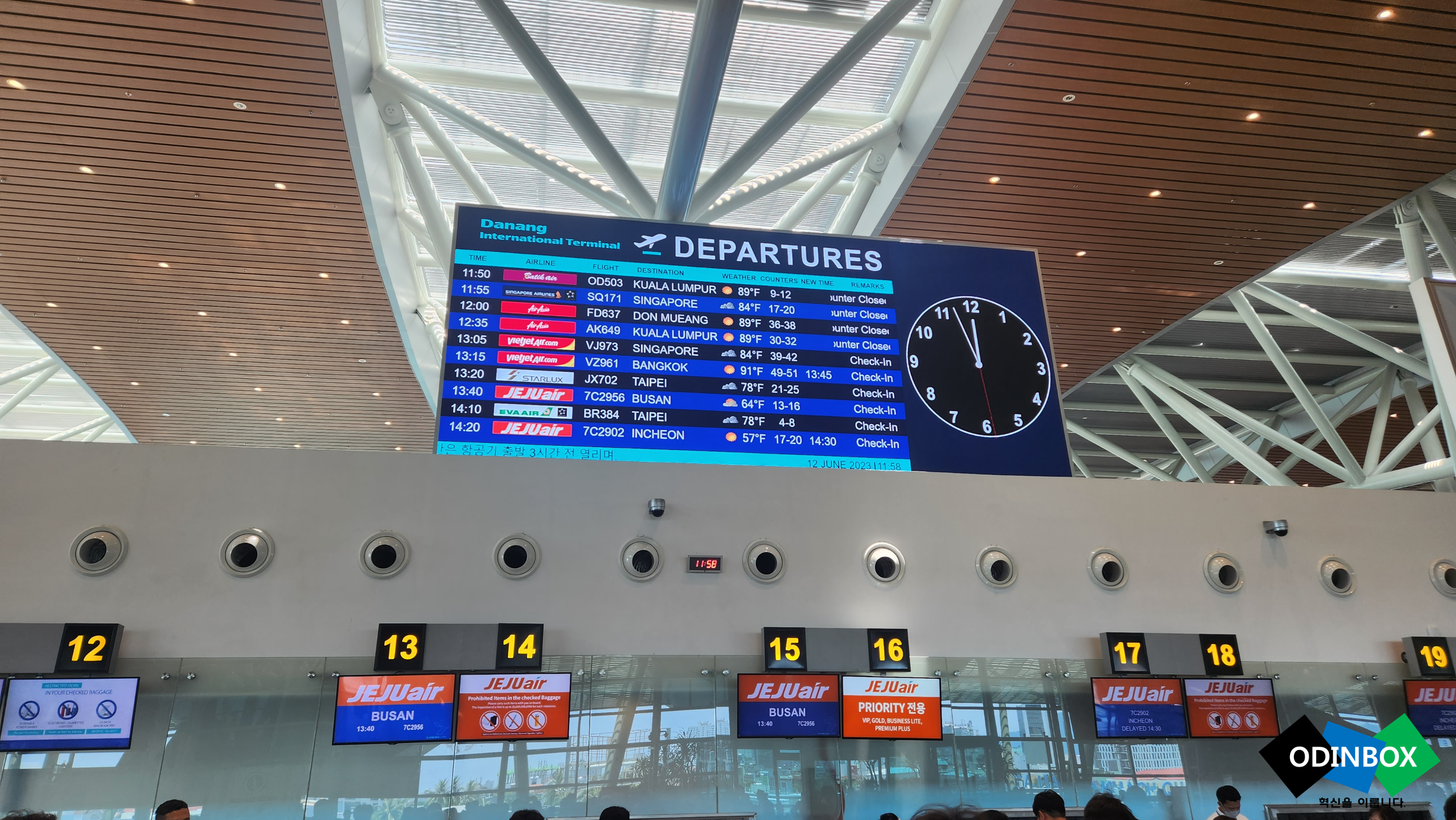 Sau khi đến sân bay, làm thủ tục xuất cảnh, chúng tôi đã đi đến nơi nhập cảnh. Tôi đã nhìn quanh xem có cần gì ở cửa hàng miễn thuế không, nhưng thực tế trong thời gian qua tôi đã nghe nói rằng giá cả không bị đóng thuế nên rẻ, nhưng tôi không cảm thấy rẻ như tôi nghĩ. Chúng tôi đã nhìn xung quanh một lượt và thông báo rằng từ 9 giờ có thể lên máy bay. Chuyến bay 4C2955 sẽ được lên Jeju Air (JEJUAIR) khi đi Đà Nẵng. Thật may mắn vì đây là chuyến du lịch đầu tiên và tôi muốn xem phong cảnh bên ngoài máy bay, nhưng may mắn là tôi có thể ngồi cạnh cửa sổ. Đã 9 giờ 30 phút và cất cánh cùng với thông báo của phi hành đoàn. Khi tôi tìm kiếm trên Internet, có một câu nói rằng khi cất cánh và hạ cánh, nó rất rung, nhưng nó không rung nhiều như tôi nghĩ. Chiếc máy bay nặng nề đó bay lên trời, dần dần xa mặt đất và bắt đầu bay lên cao. Tôi muốn chụp nhiều nơi với phong cảnh lần đầu tiên được nhìn thấy, nhưng phần đường băng sân bay Gimhae và phía này do an ninh cấm chụp ảnh nên sau một thời gian, tôi đã chụp ảnh khi đang bay trên bầu trời. Chúng ta bắt đầu nhìn thấy đất liền ở nơi chỉ nhìn thấy mây và bầu trời kéo dài 5 tiếng đồng hồ. Dường như cho chúng ta biết rằng chúng ta đã đến Việt Nam trên đất liền đó. Và một lát sau, chúng tôi hạ cánh xuống sân bay quốc tế Đà Nẵng. Tôi được làm thủ tục vào cửa sân bay, thật ra có rất nhiều người Hàn Quốc đến Đà Nẵng, Việt Nam, nhưng cán bộ kiểm tra nhập cảnh chỉ xem sơ qua và đóng dấu ngay. Mình đã suy nghĩ không biết phải làm sao khi bắt chuyện với các bạn, nhưng mình sẽ làm ngay và luôn! Cảm giác như vậy đó. Ra khỏi sân bay quốc tế Đà Nẵng, xe đang chờ cùng hướng dẫn viên địa phương. May mắn thay, tôi đã nghĩ rằng sẽ thoải mái hơn khi có một chiếc xe buýt lớn hơn tôi nghĩ. Cảm giác đầu tiên ở Việt Nam là 'Wow, nóng quá'. Xe buýt xuất phát và cùng với sự giới thiệu của hướng dẫn viên đã xuất phát điểm đến đầu tiên.
