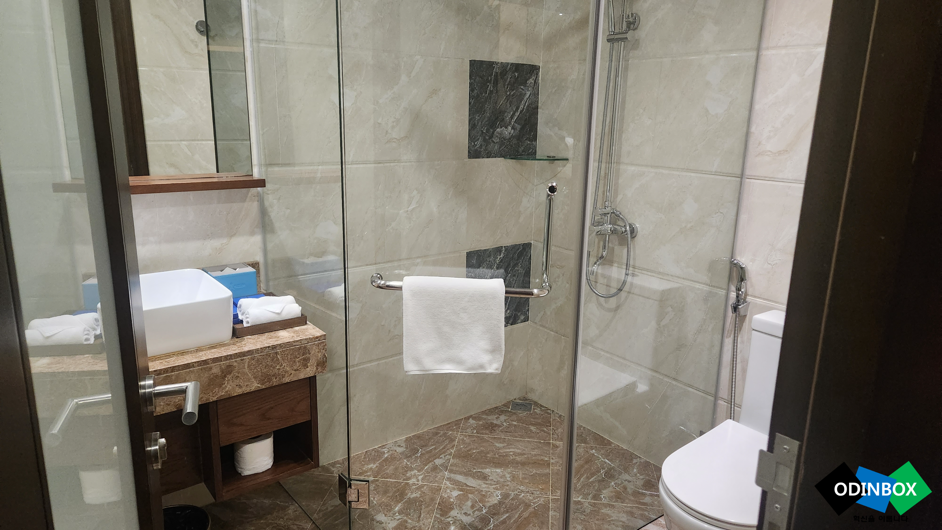In my case, I used one room for two people, so I liked the night view because there was a bathtub, a shower room, and a refrigerator in the bathroom along with two beds, and when I closed the curtains, I could see the night view with the beach. I definitely felt different from Korea. That's how I unpacked and spent my first night in Vietnam.
