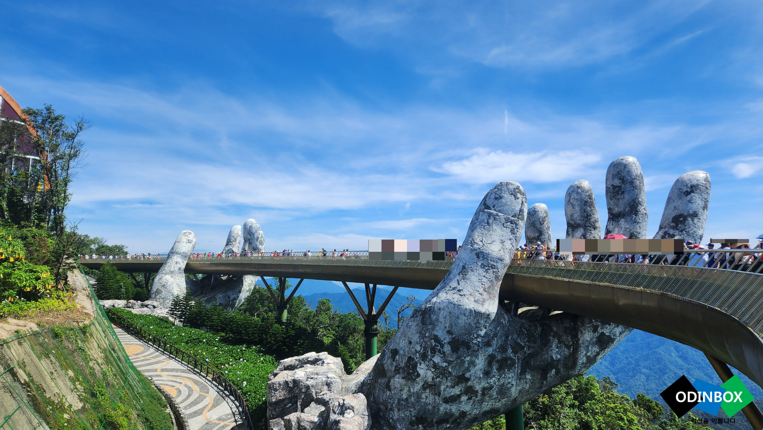 The first stop on the third day of the tour is called Bana Hill. As the name suggests, it is located on a mountain, where there is the second longest cable street in the world. So, if you take this cable car, it takes about 10 to 15 minutes. One of the reasons why I like this place is that it's quite hot down there, but if you go up by cable car, it's really cool because it boasts a height of about 1,400 meters. And it's really amazing with the scenery like a European village. It's also a vacation spot to avoid the heat, and Golden Bridge, which we've probably seen a few times, is located there. There is a French village and there is a theme park that is not actually inhabited, and you can see a lot of foreigners along with the scenery that really feels like you are in Europe. In the case of Golden Bridge, there were so many people to take pictures that it was hard to move. Also, in the case of theme parks, there are no various rides, but they are fun enough and show the scenery of Europe, adding to the fun of looking around.
