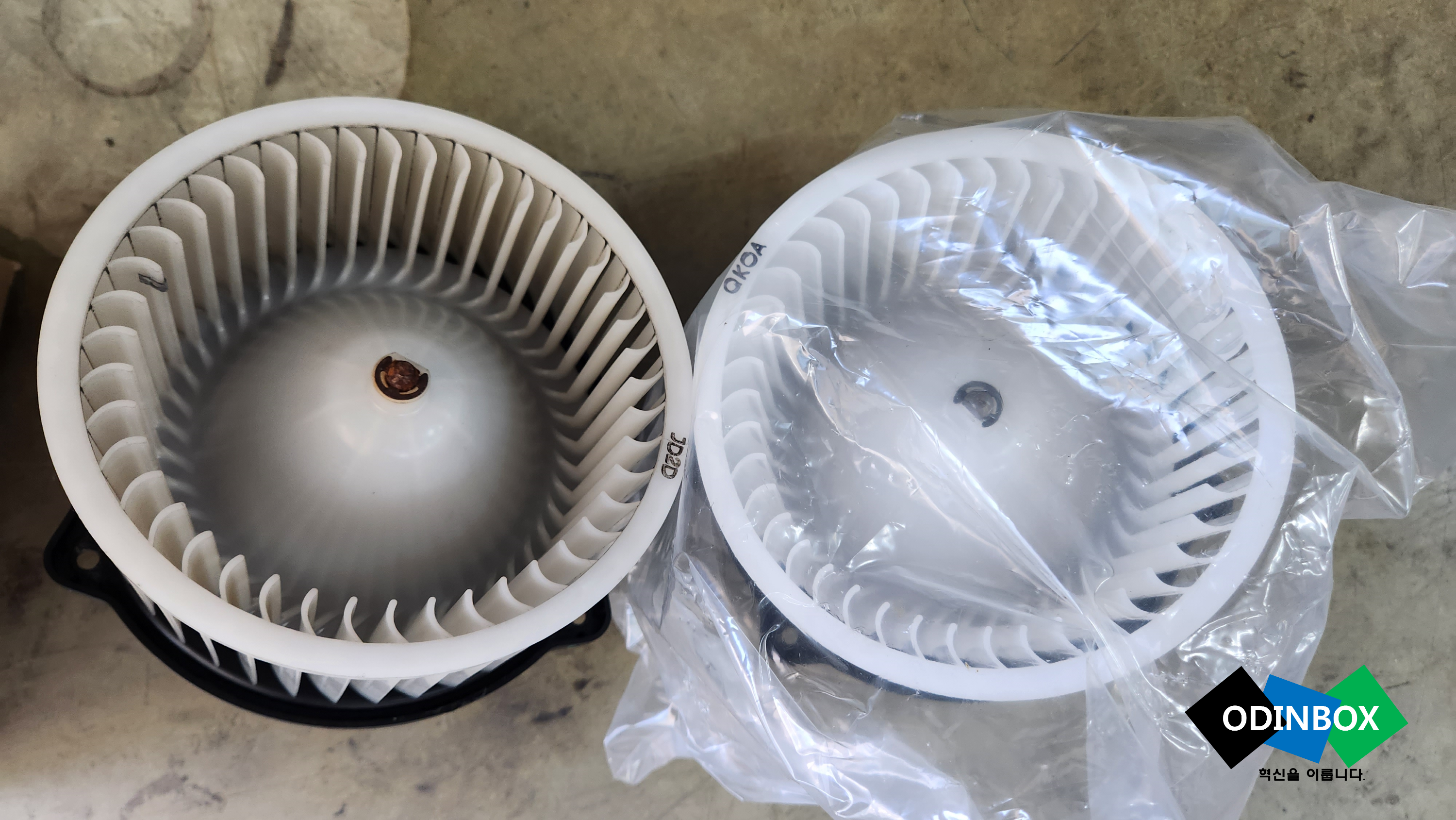 탈거를 하고 신품과 비교를 했습니다. 사실 눈에 보이는 부분들은 블로워모터에서 펜 부분이라 크게 문제가 되는 부분은 아니지만 오래된 차들의 경우 모터에 베어링이나 모터가 문제가 되어 잡음이 나는 경우가 대부분입니다. 또 일부 필터에 많은 이물질이 있는 상태에서 교체를 하다가 큰 이물질이 펜에 끼여 소리가 나는 경우도 있다고 합니다. 검색을 해보니 모터를 청소해서 사용을 하는 경우가 있는데 그렇게 하는 것보단 비용이 크게 부담되지않기 때문에 신품으로 교환을 선택하고 교체를 합니다.