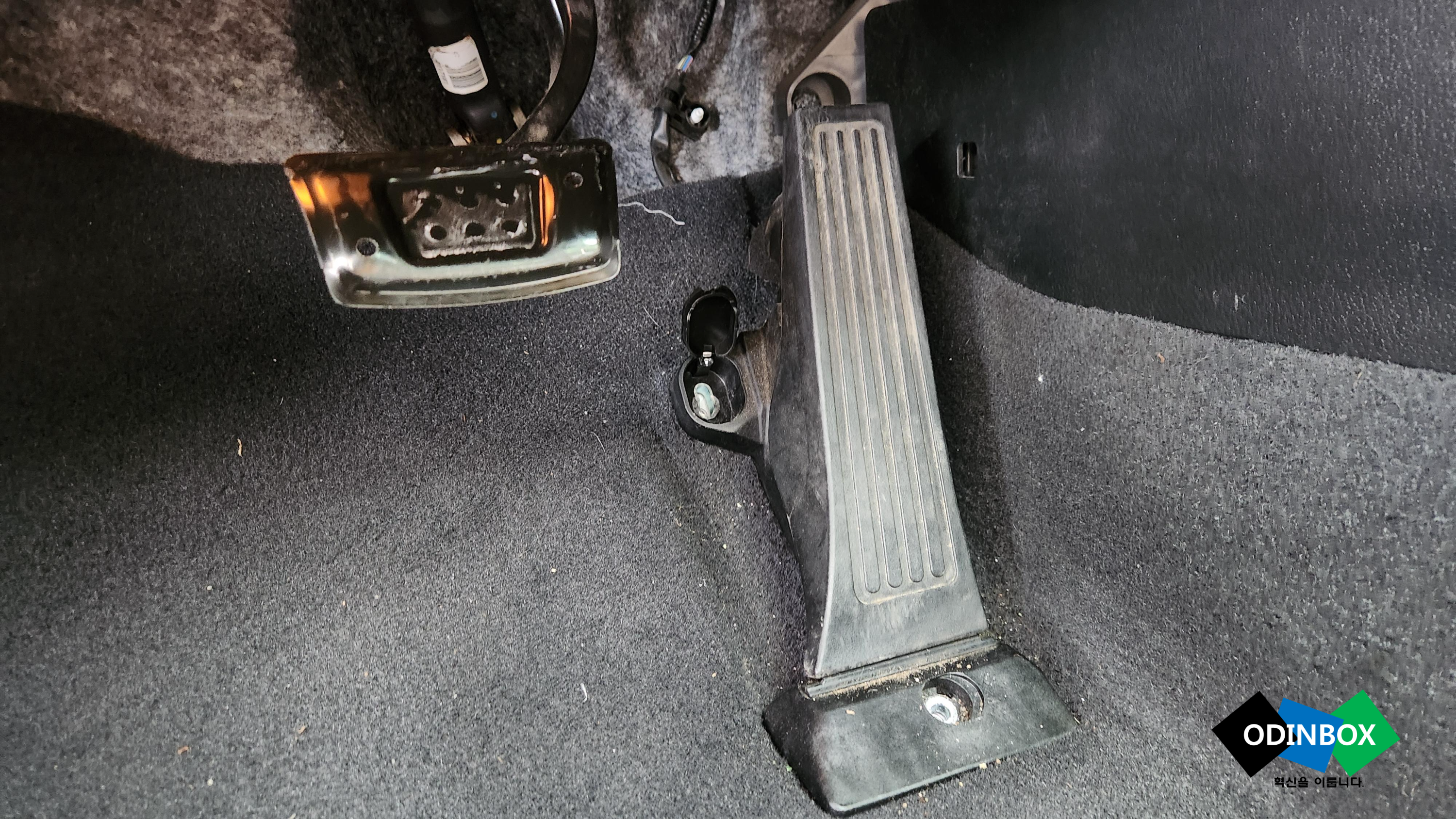 볼트를 풀고 당기면 커넥터는 연결된채로 흔들거리는 것을 볼 수 있습니다. 그러면 자동차와 연결된 커넥터를 분리를 하면 페달과 완전히 분리를 할 수 있습니다. 분리를 하고 난 뒤의 모습입니다. 생각보다 더렵죠? 간단하게 정리하고 다시 장착을 해보도록 하겠습니다.