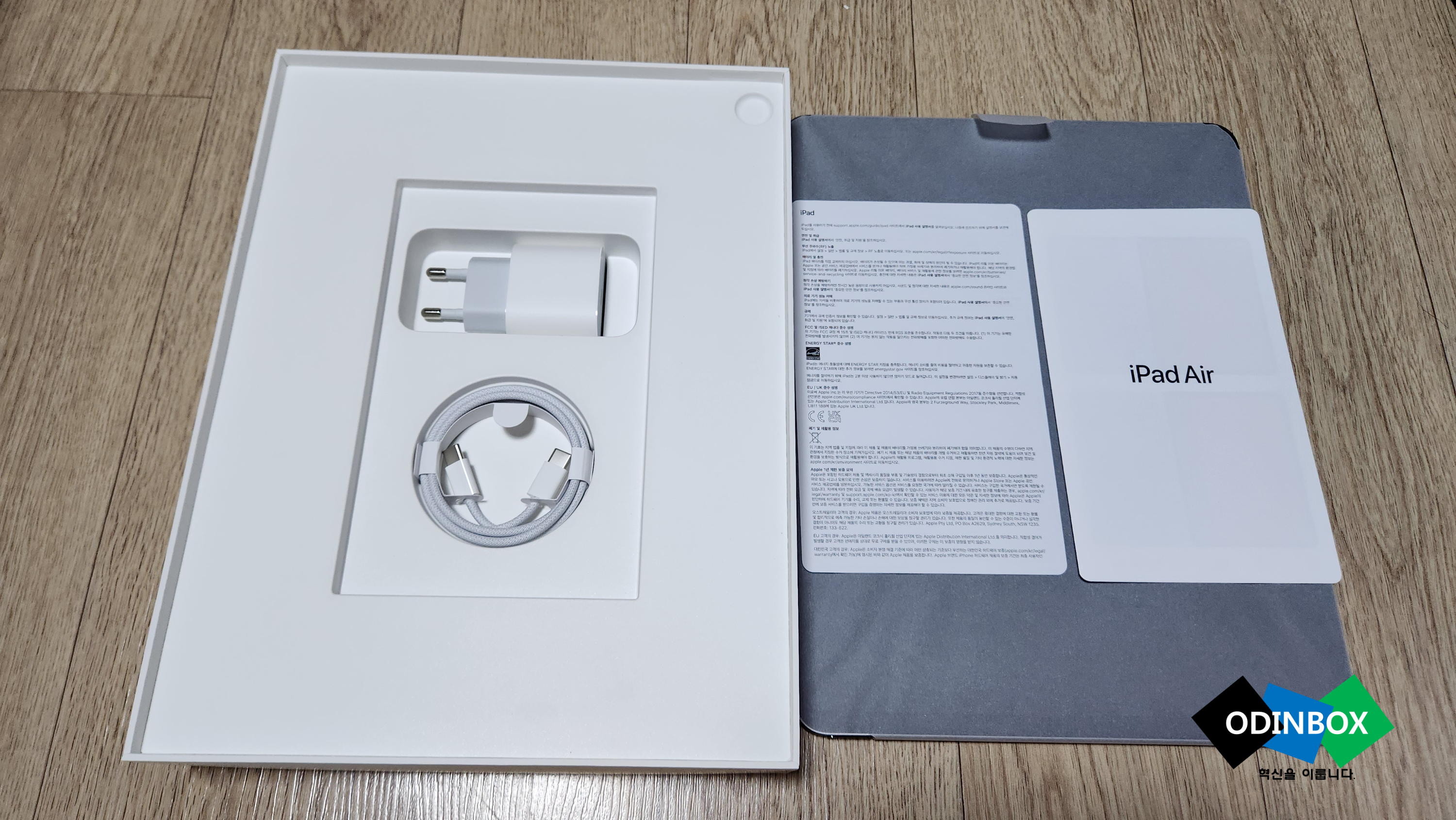 영롱한 아이패드가 바로 보이고 그 안에 보면, 설명서와 함께 충전기 그리고, 충전 케이블까지 있는 것을 볼 수 있습니다. 다행히 아이패드 에어에는 충전 케이블을 주는가 보네요 친환경이라는 이름으로 자꾸 이런 것들이 간소화되는데 사실 너무 불편합니다.