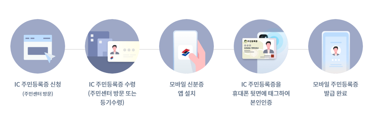 IC 주민등록증 신청(주민센터 방문) → IC 주민등록증 수령(주민센터 방문 또는 등기수령) → 모바일 신분증 앱 설치 → IC 주민등록증을 휴대폰 뒷면에 태그하여 본인인증 → 모바일 주민등록증 발급 완료