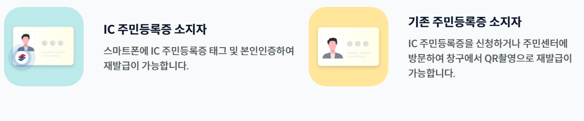 기존 주민등록증 소지자 - IC 주민등록증을 신청하거나 주민센터에 방문하여 창구에서 QR촬영으로 재발급이 가능합니다.