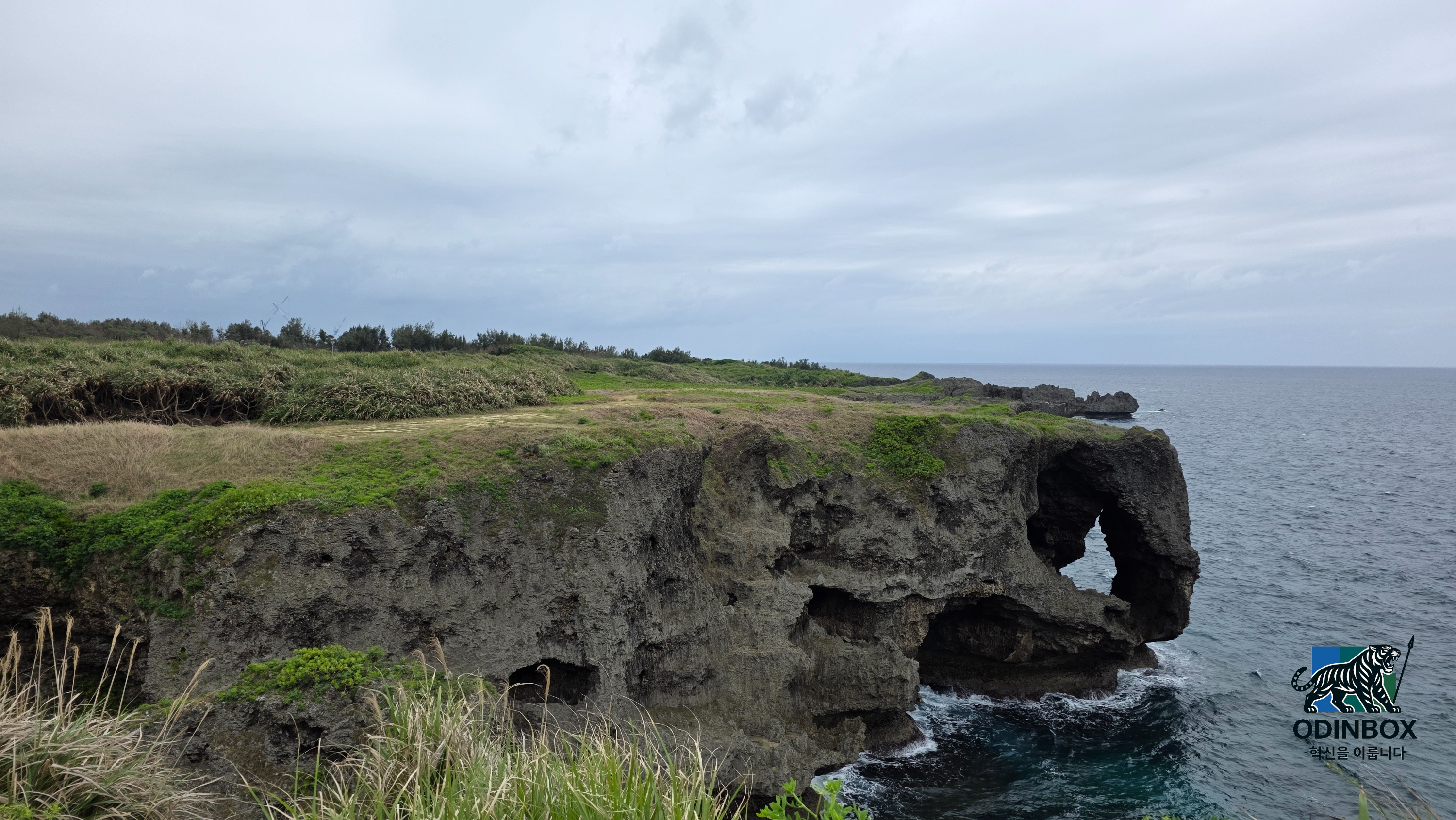 둘째 날, 첫 번째 방문지는 만좌모였습니다. 류큐왕국 시대, 왕이 '만 명이 앉아도 충분하다'라고 감탄한 장소로, 기이한 석회암 지형과 잔디밭, 그리고 바다 풍경이 인상적이었습니다. 비바람이 심하니 모자 착용은 주의가 필요합니다.