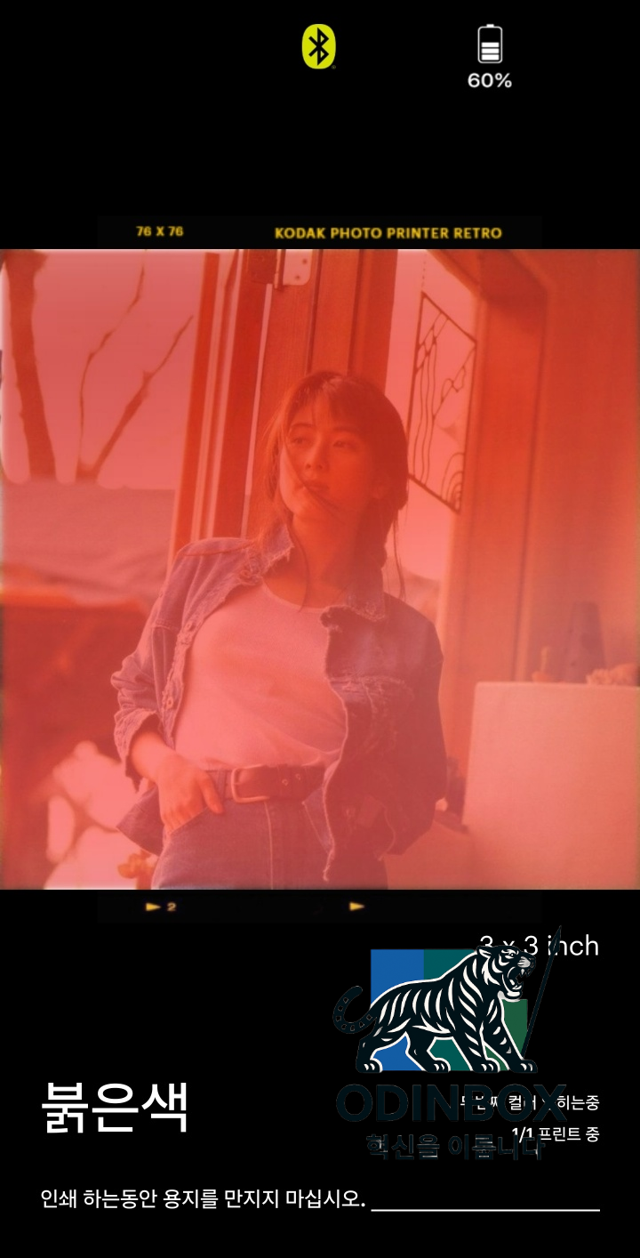 전원을 켜고 스마트폰에서 KODAK PHOTO PRINTER 앱을 설치합니다. 앱에서 블루투스를 통해 P300R을 선택을 하면 연결이 완료됩니다. 사진을 불러와 간단한 편집 기능(필터, 프레임, 스티커 등)을 적용한 뒤 인쇄 버튼을 누르면 즉시 출력이 됩니다. 4PASS 염료승화 방식은 CMYK 네 번의 전사 과정을 거쳐 색을 쌓아 올린 후 마지막에 보호 라미네이션을 입히는데 덕분에 사진이 번지거나 물에 젖는 것을 방지해 줍니다.