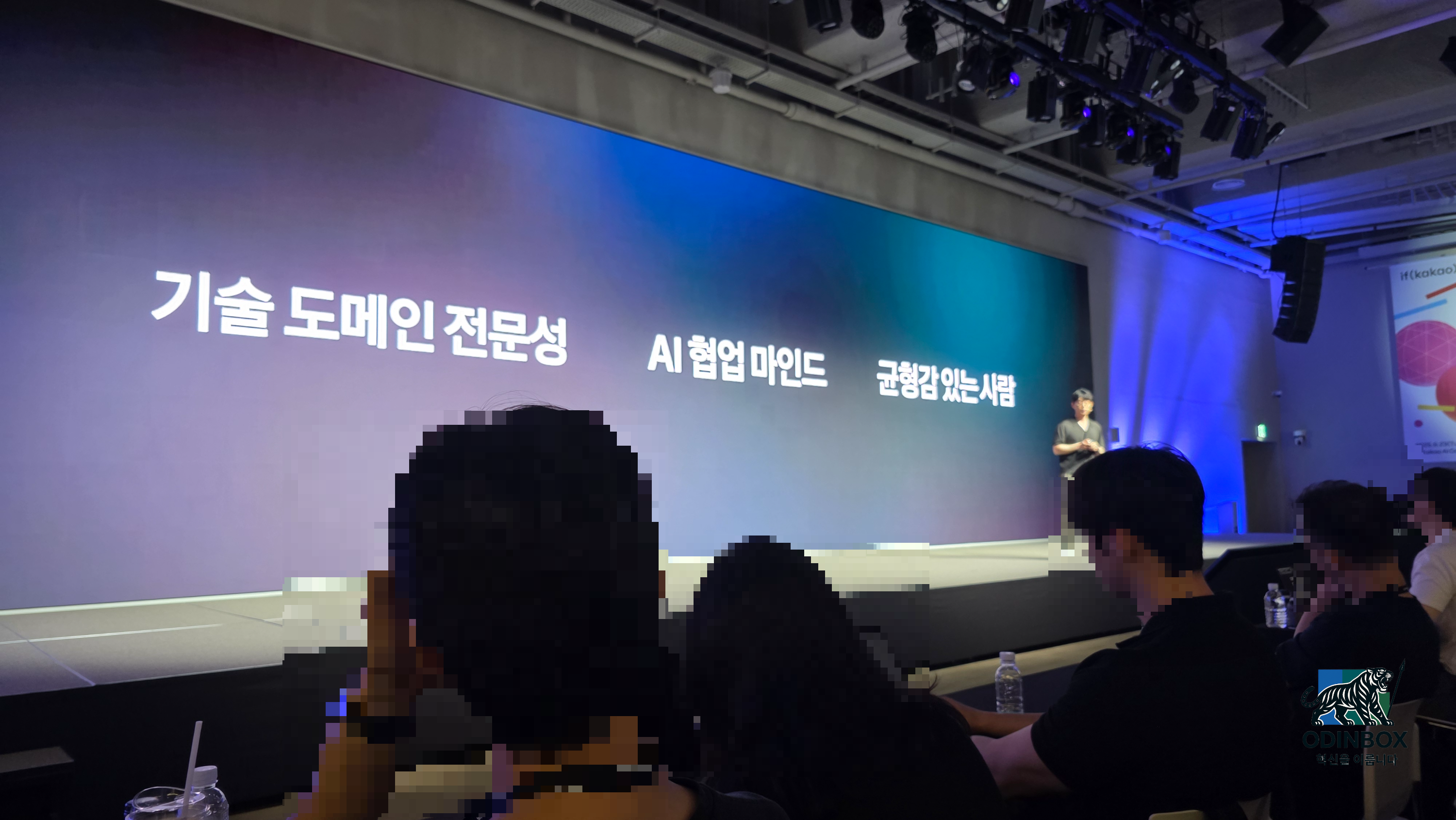 9월 24일 아침 7시에 일어나 준비를 마쳤고 8시 10분쯤 강남역 5번 출구에 도착을 했습니다. 셔틀 탑스안내 피켓을 든 진행요원을 따라 QR코드로 탑승 확인을 했고 8시 30분 정시에 셔틀이 출발했습니다. 약 한 시간 후 용인 수지구에 위치한 카카오 AI캠퍼스에 도착을 했고 간단히 초대권 확인을 마치고 웰컴 키트를 수령했습니다. 본 행사장으로 이동을 하니 직원분들의 박수 환대가 이어졌고 극I였던 저로써는 잠시동안 공포의 시간이였고 일찍 도착하여 거의 맨 앞줄에 착석을 할 수 있었습니다. 그 이후 참가하는 분들도 많이 들어왔습니다.